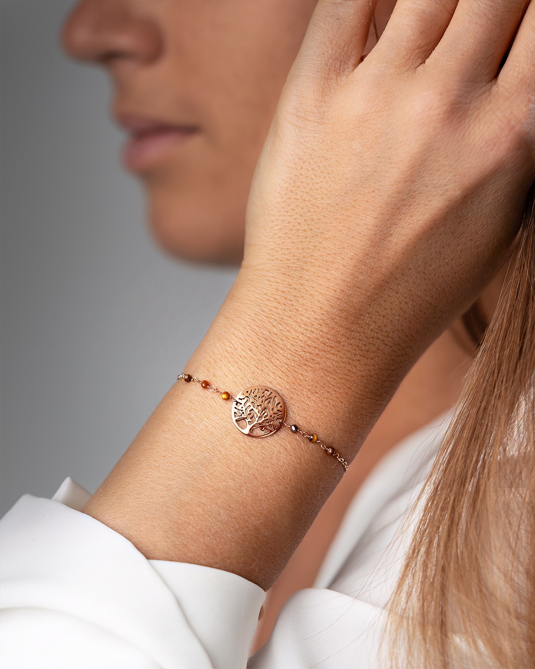 Le bracelet Messito se caractérise par une chaine élégante ornée de six petites pierres facettés en Oeil de tigre, mettant en valeur un arbre de vie en son centre.