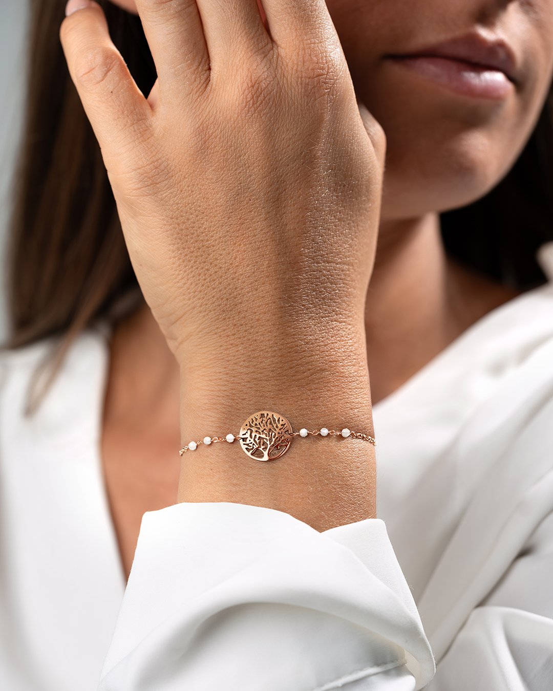 Le bracelet Milato se caractérise par une chaine élégante ornée de six petites pierres facettés en pierre de lune, mettant en valeur un arbre de vie en son centre.
