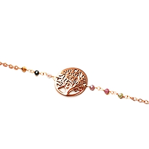 Le bracelet Monzati se caractérise par une chaine élégante ornée de six petites pierres facettés en tourmaline multicouleur, mettant en valeur un arbre de vie en son centre.
