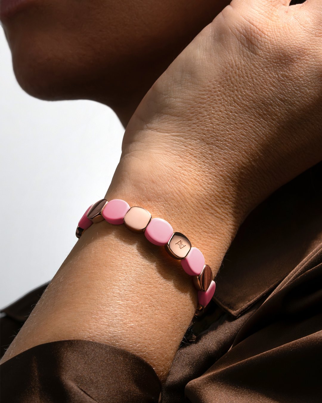 Raffiné et lumineux, il séduit par son jeu d’alternance délicat entre le métal rosé et le métal rose, créant un contraste subtil qui capte la lumière avec grâce.
