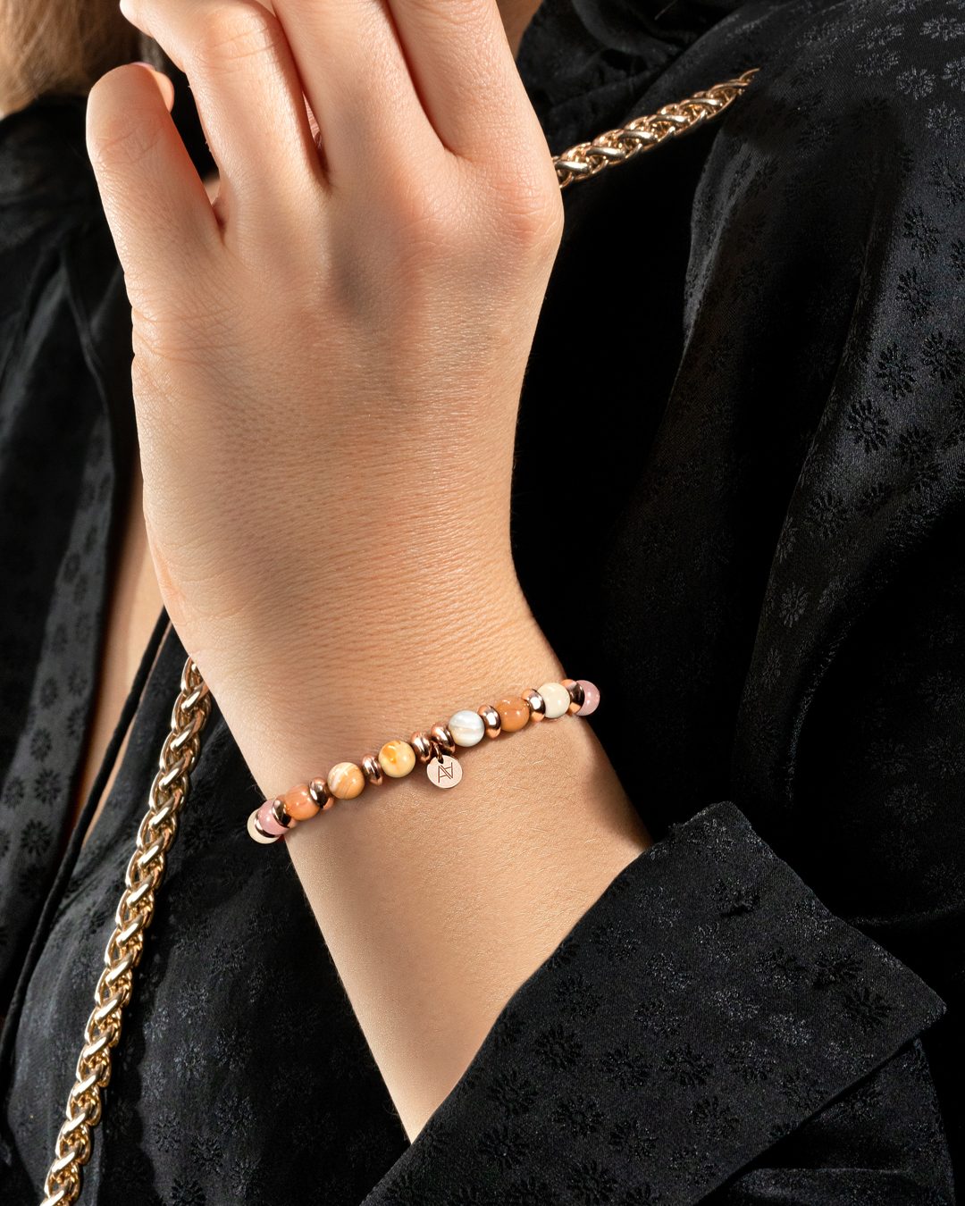 - Matière du bracelet Acier rosé inoxydable et Agate du Botswana rose