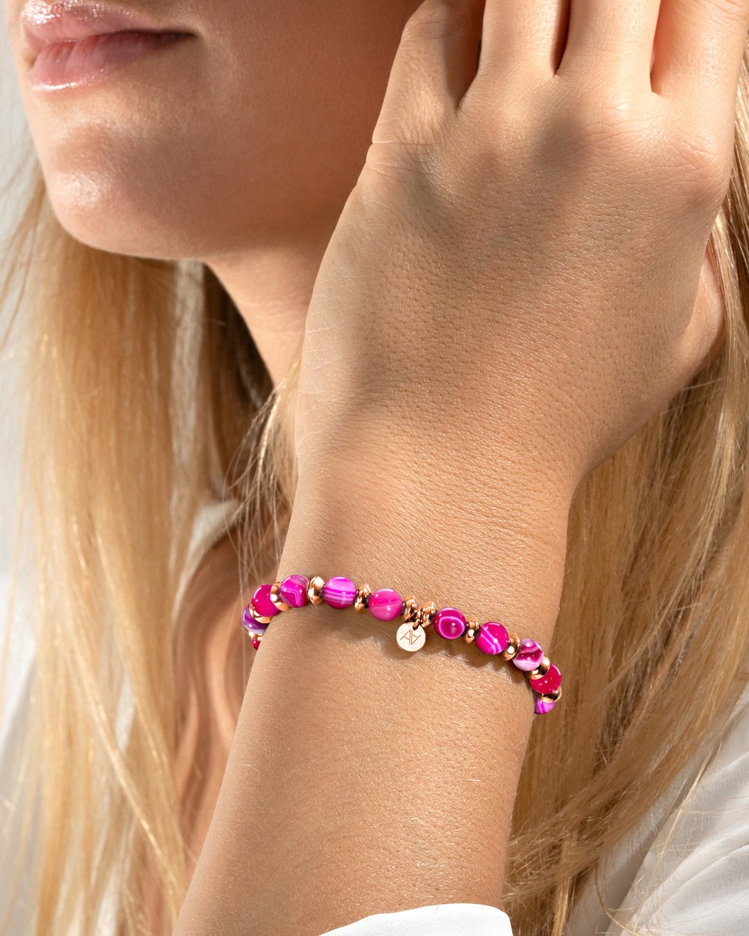 La pièce centrale est une pastille signée Anna Velazia en acier rosé inoxydable, apportant une touche élégante et chaleureuse à votre poignet.