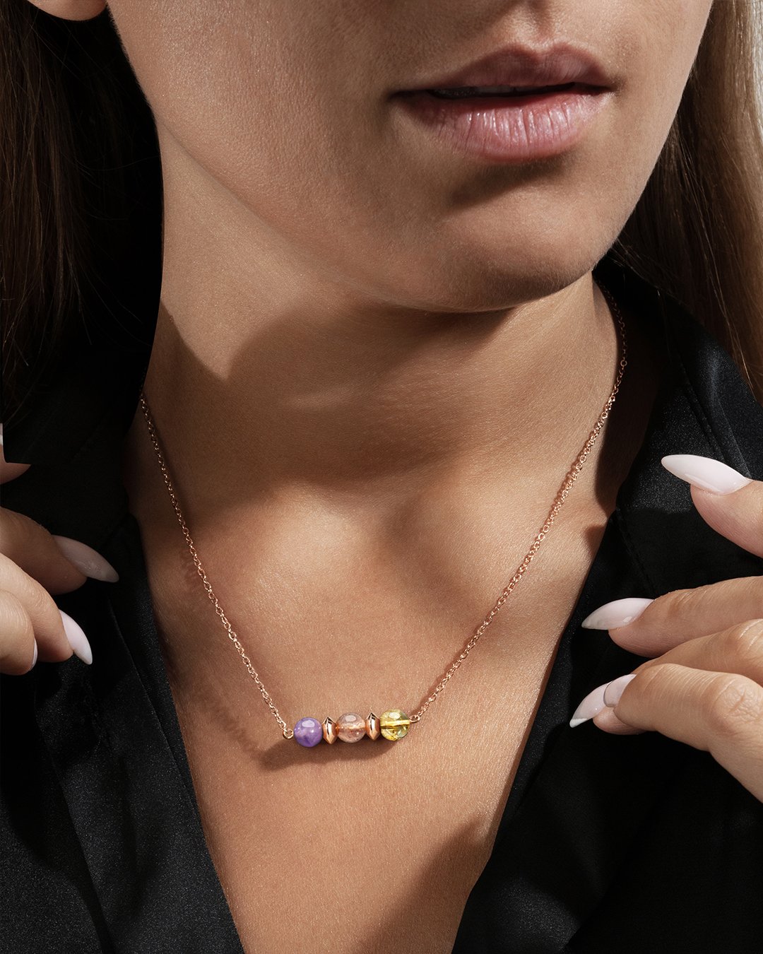 Le collier Salentio est composé de 3 magnifiques pierres en super seven, minutieusement disposées entre des séparateurs en acier rosé.